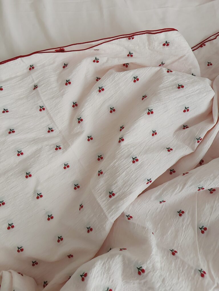Those cheerful cherries make my bedroom feel like a French patisserie! The piping adds such vibrant contrast, and the fabric is incredibly soft. Waking up has never been more delightful.