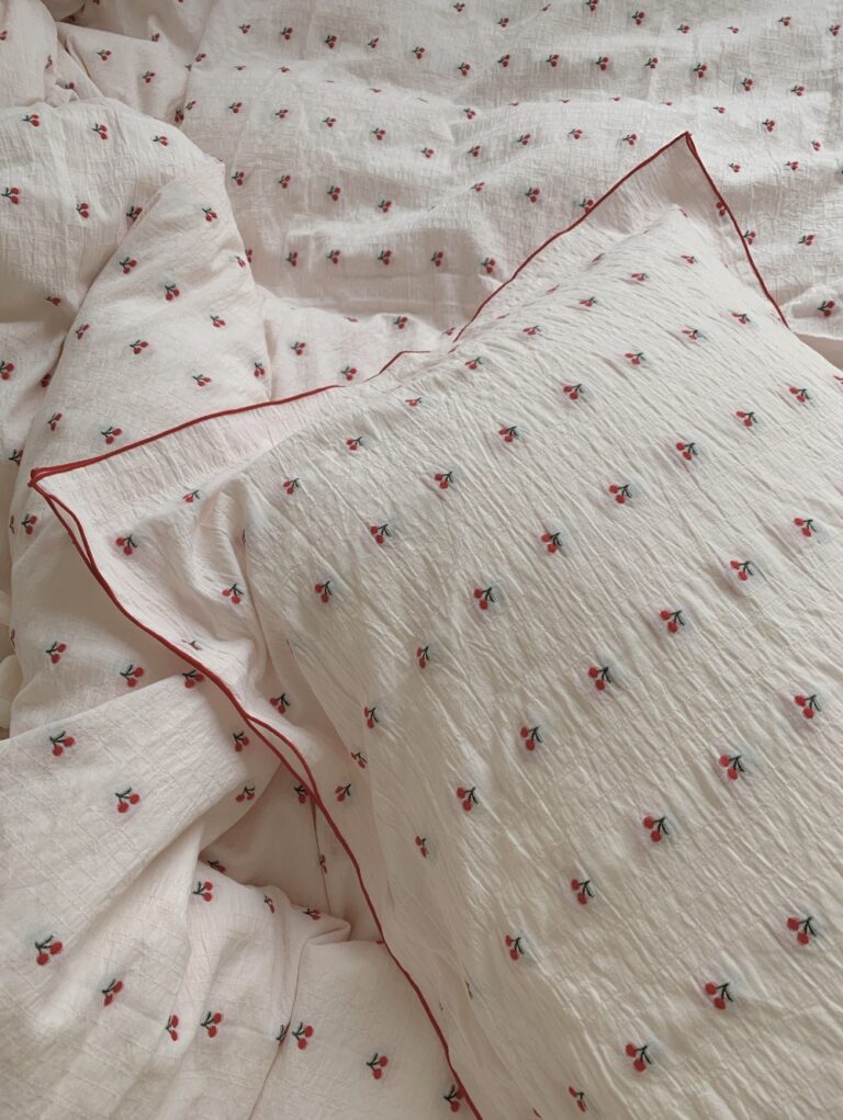 Climbing into this cherry-adorned bed feels like a vacation. The vibrant piping makes the design pop, and the fabric softens beautifully with each wash. Pure comfort!